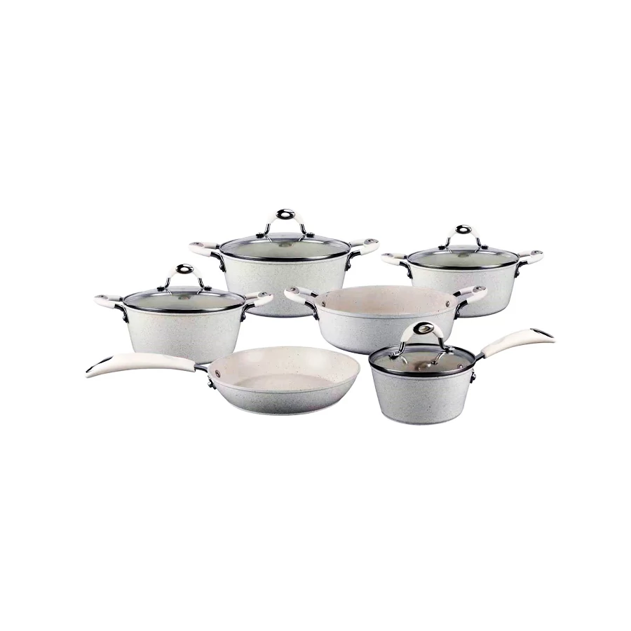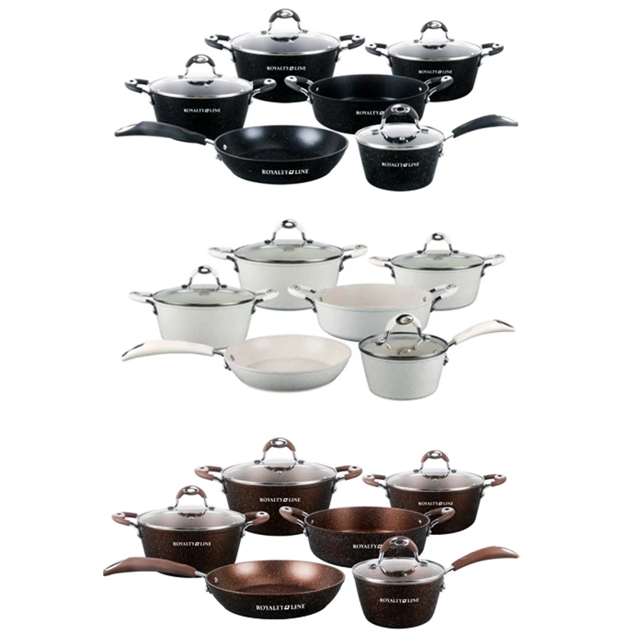 Súprava riadu Royalty Line RL-5010CRM s bielym mramorovým povrchom je ideálnou voľbou pre milovníkov praktického a štýlového varenia. Táto súprava obsahuje 6 hrncov rôznych veľkostí a panvicu. K 4 hrncom sa dodávajú sklenené pokrievky. Pokrievky hrncov sú vybavené funkciou uvoľňovania pary pre optimálne výsledky varenia. Všetky výrobky majú nepriľnavý mramorový povrch, ktorý umožňuje zdravé varenie s nízkym obsahom tuku. Okrem toho má riad odolné tvarované telo pre dlhú životnosť a spoľahlivosť. Vďaka procesu vypaľovania je vonkajší povlak odolnejší, čím si zachováva krásu a funkčnosť po dlhú dobu, a dizajn vhodný na umývanie v umývačke riadu uľahčuje čistenie. Rukoväte výrobkov sú odnímateľné, čo umožňuje používať riad aj v rúre.