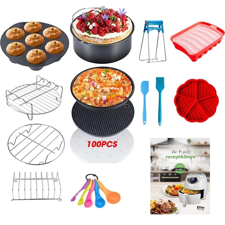 Pozor! Výrobok je možné objednať v niekoľkých veľkostiach, pretože veľkosť koša každej teplovzdušnej fritézy sa môže líšiť. Pred objednaním si skontrolujte rozmery vlastnej fritézy! Väčšina položiek v balení má priemer 20 cm, ale 1 - 2 položky môžu mať o niečo menší priemer, aby boli kompatibilné s inými položkami (napr. vaflovač sa zmestí do panvice na pizzu a dá sa premiestniť, keď je horúci).