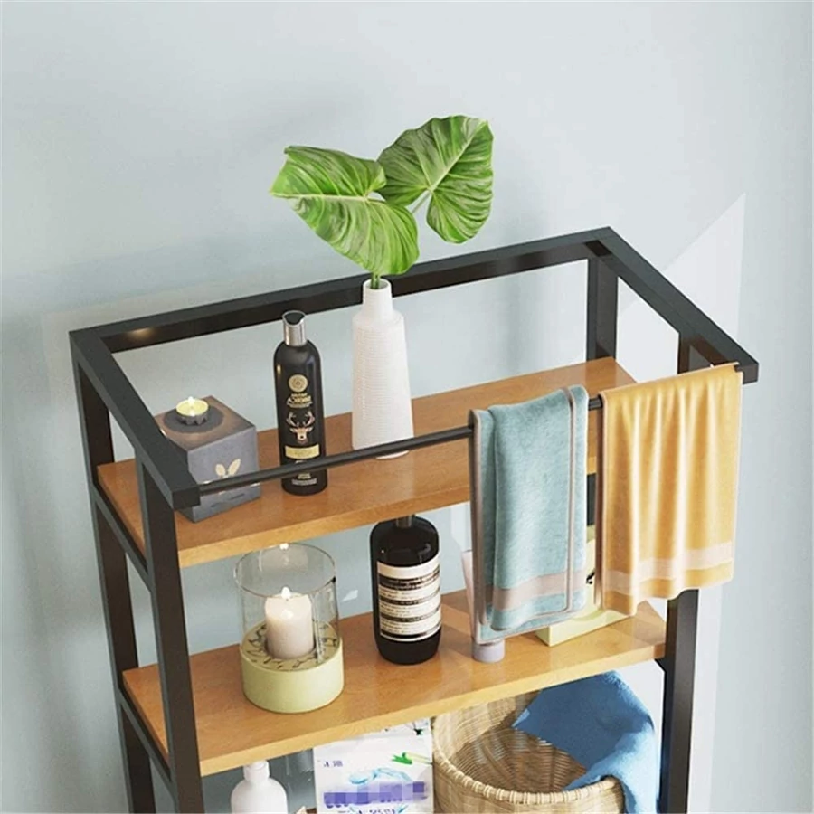 3-stupňový pevný kovový kúpeľňový regálový systém s drevenými policami nad práčkou, čierny - 175 cm