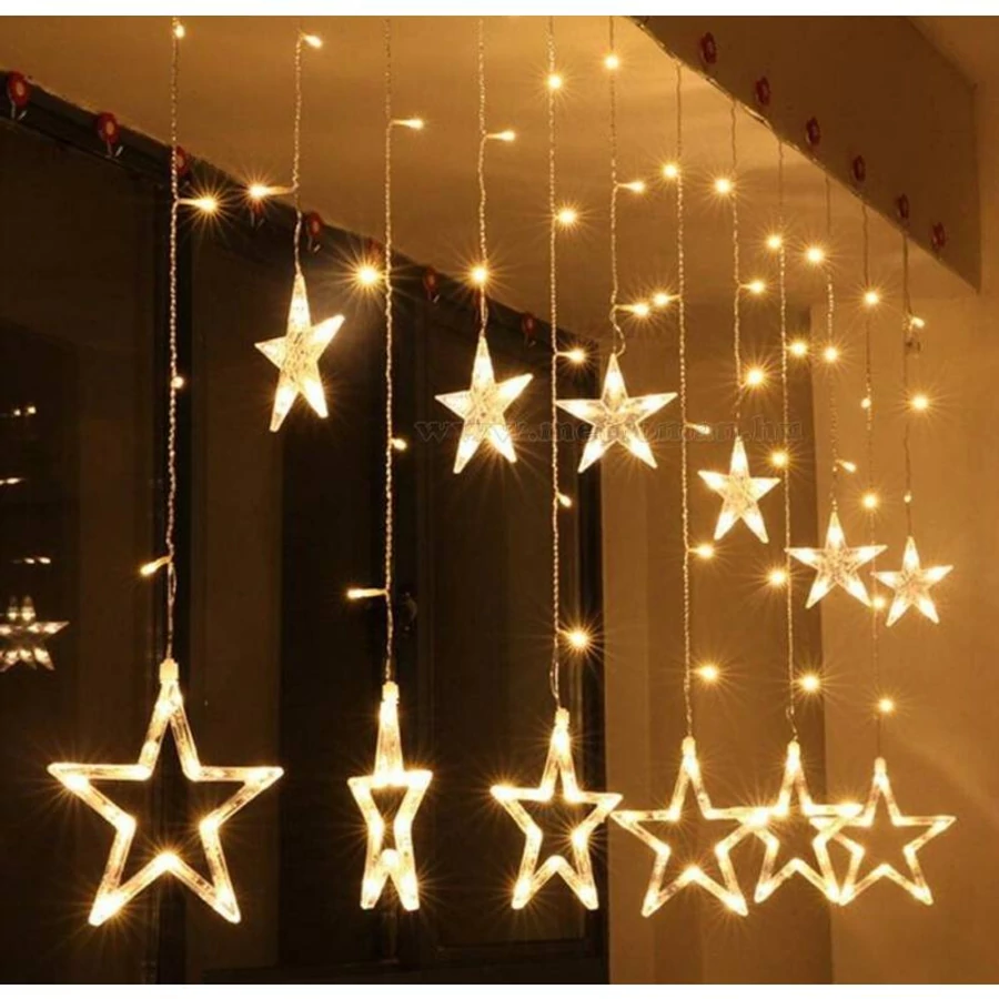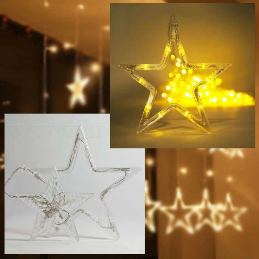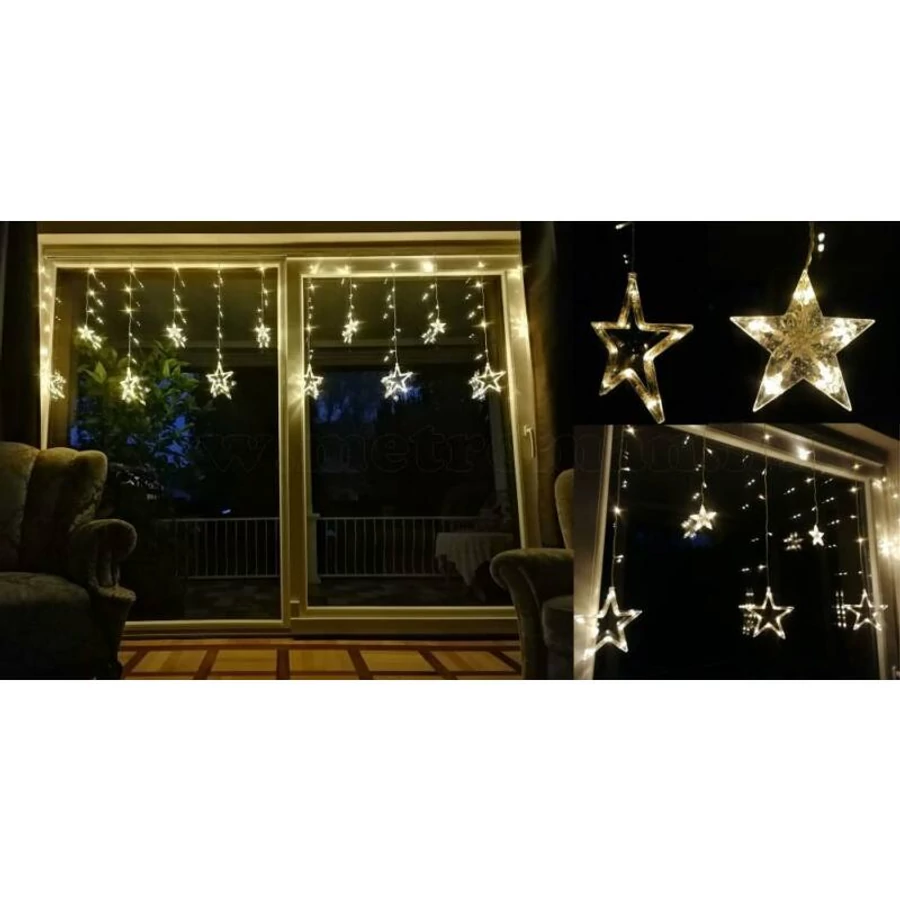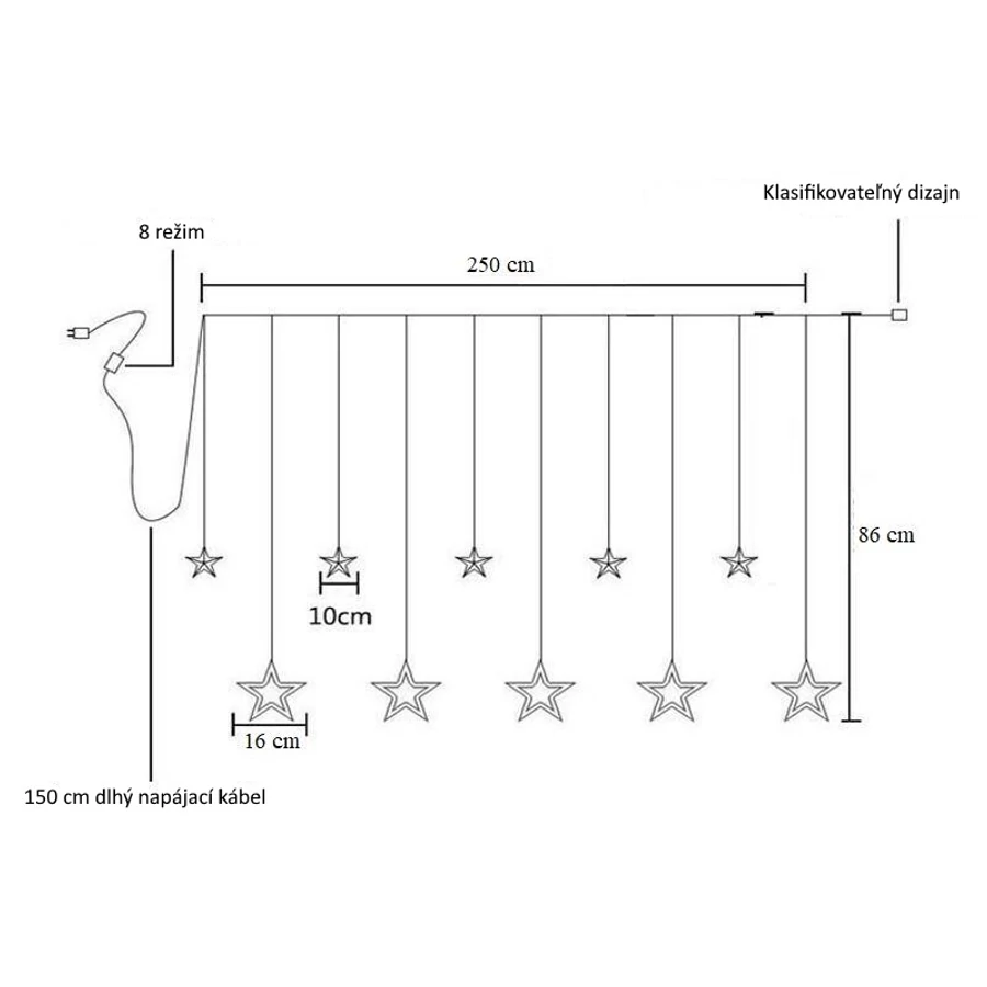 Vianočné dekoratívne osvetlenie s vysokým jasom a teplou bielou farbou. Svetelný záves je dlhý 250 cm a má stohovateľný dizajn, takže je možné pripojiť až 2 svetelné závesy nepretržite pomocou jednej zástrčky. Na svetelnom závese je 6 veľkých 16 cm hviezd a 6 menších 10 cm hviezd. Strieda sa zavesenie väčšej a menšej formy, celková dĺžka závesu je 86 cm. LED svetelné zdroje boli tiež umiestnené na kábli, ktorý drží formuláre, takže získame krásny, jednotný svetelný záves.