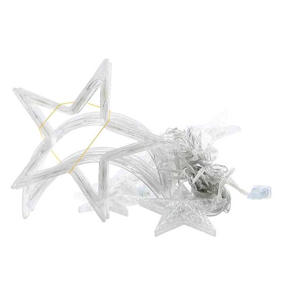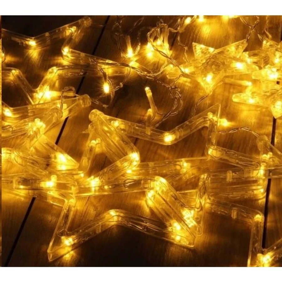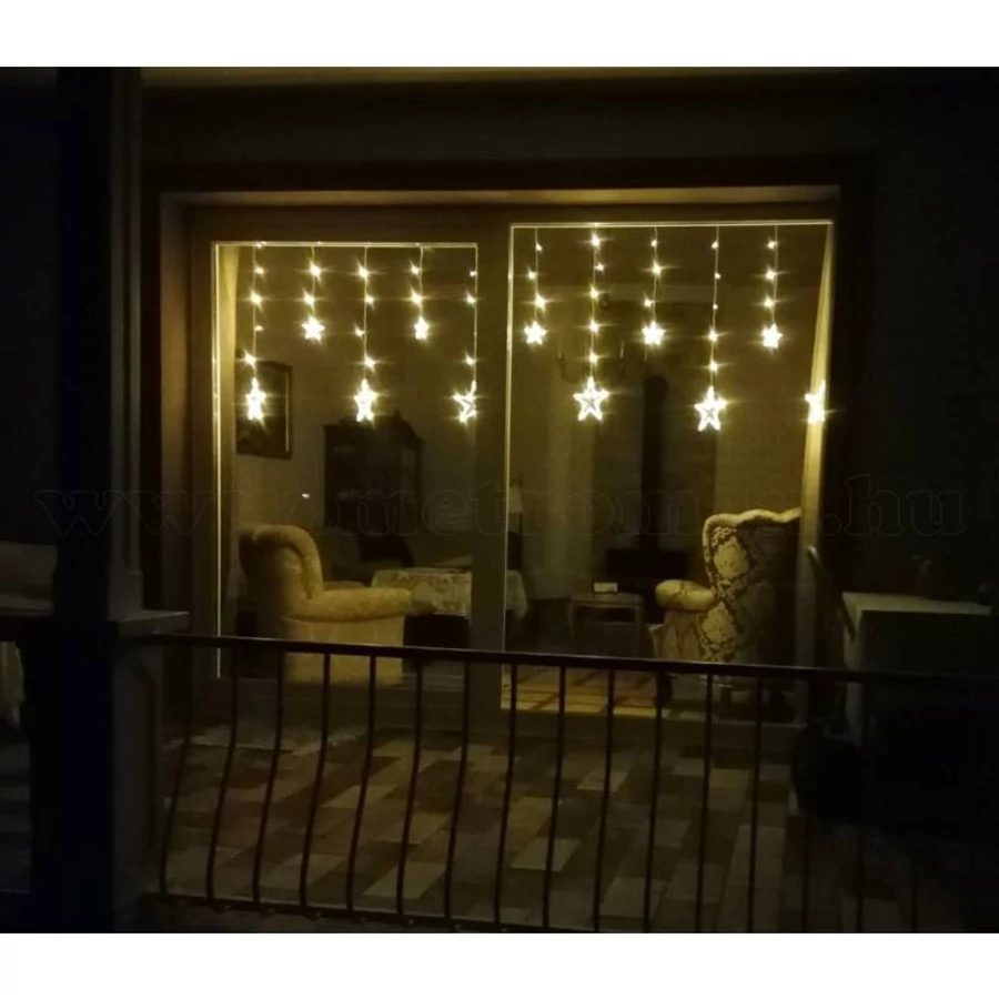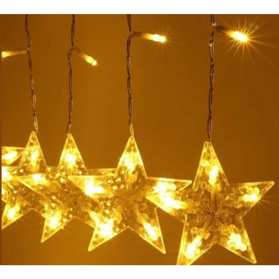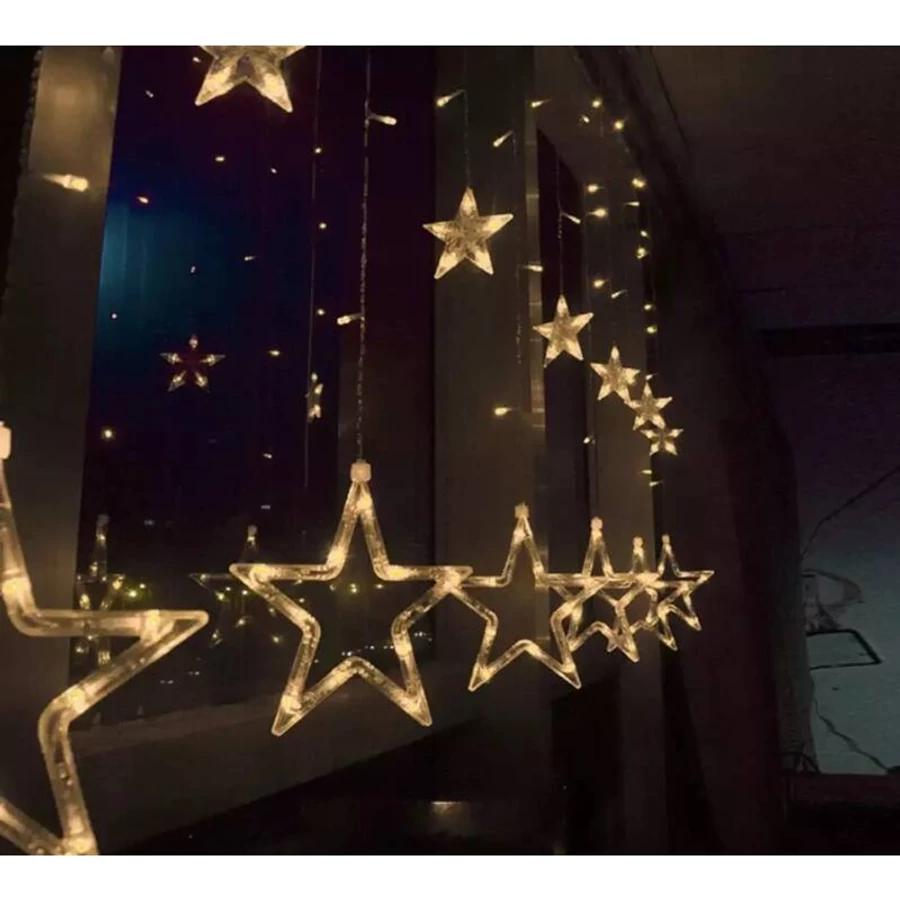 Vianočné dekoratívne osvetlenie s vysokým jasom a teplou bielou farbou. Svetelný záves je dlhý 250 cm a má stohovateľný dizajn, takže je možné pripojiť až 2 svetelné závesy nepretržite pomocou jednej zástrčky. Na svetelnom závese je 6 veľkých 16 cm hviezd a 6 menších 10 cm hviezd. Strieda sa zavesenie väčšej a menšej formy, celková dĺžka závesu je 86 cm. LED svetelné zdroje boli tiež umiestnené na kábli, ktorý drží formuláre, takže získame krásny, jednotný svetelný záves.