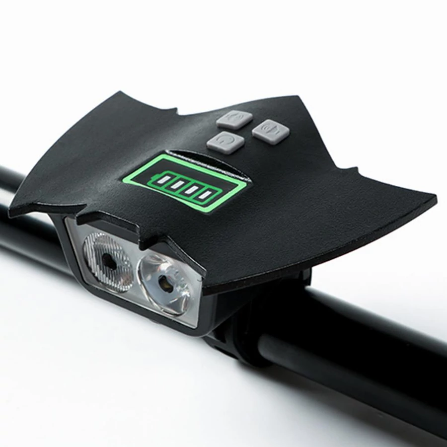 Svetlo na bicykel v tvare netopiera, ktoré nielen dobre vyzerá, ale aj skvele funguje! Je vybavené dvoma mimoriadne výkonnými LED diódami T6 vo vodotesnom hliníkovom ráme. Je multifunkčné, môže svietiť striedavo alebo všetkými svetlami naraz, tlmenejšie, jasnejšie a dokonca aj blikať. Ako ďalšia funkcia boli do neho zakomponované dve možnosti zvukového signálu, takže môže dokonca nahradiť zvonček na vašom bicykli. Vďaka dodanému držiaku svietidla ho možno namontovať dopredu alebo dozadu, prípadne otočiť. Držiak je vyrobený z mäkkého silikónového materiálu a nepoškodí povrchovú úpravu rámu. Batériu možno nabíjať pomocou kábla micro USB, úroveň nabitia možno kontrolovať na hornej strane zariadenia.