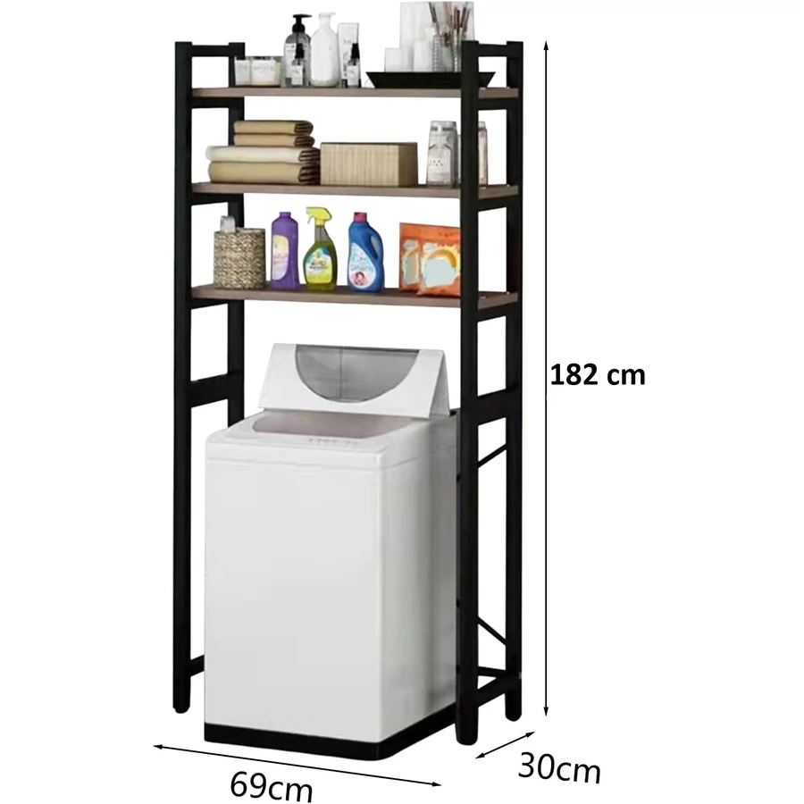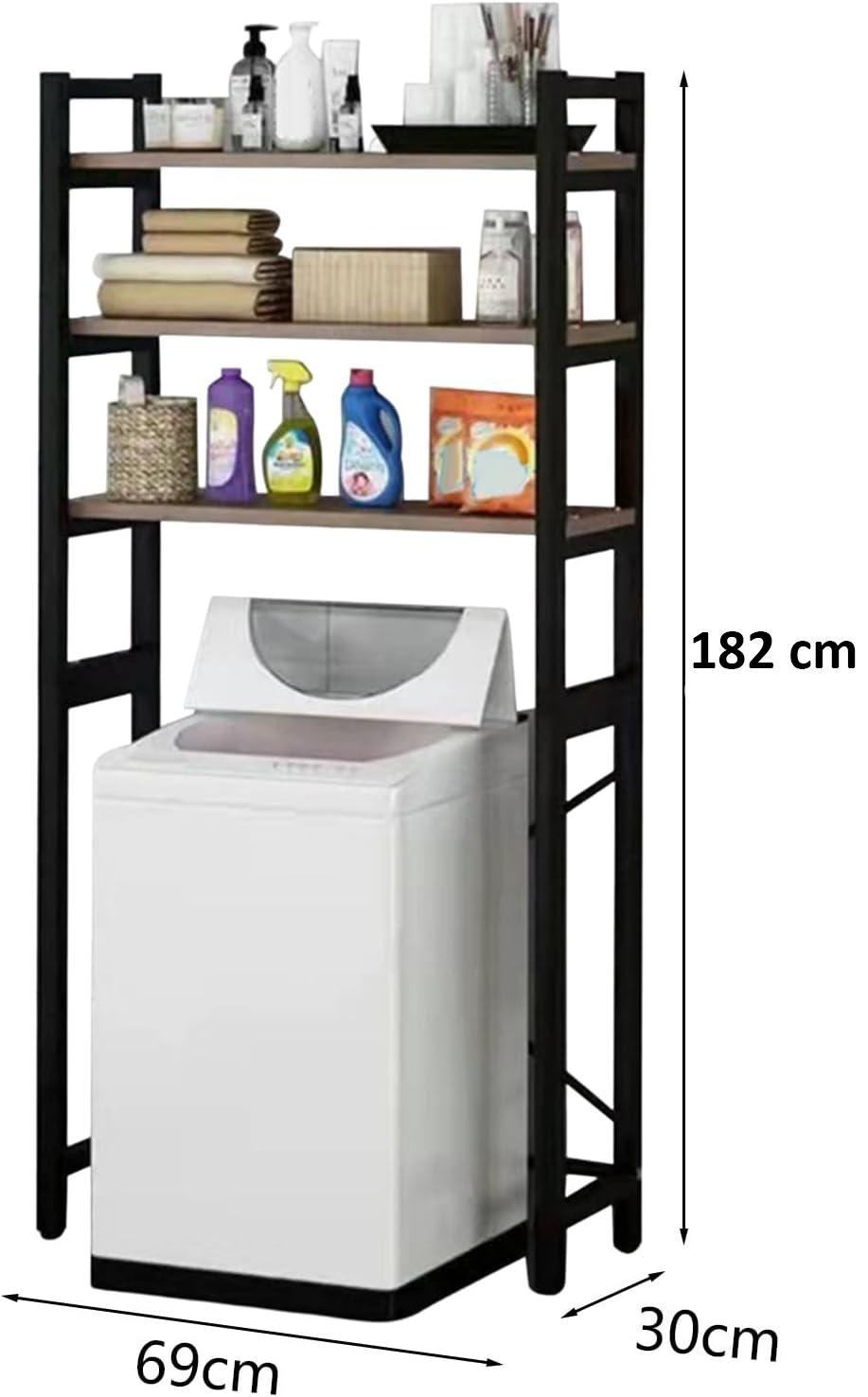 Elite Home® 3-poschodová kovová kúpeľňová polica s drevenými policami nad práčky s horným plnením, čierna - 182 cm