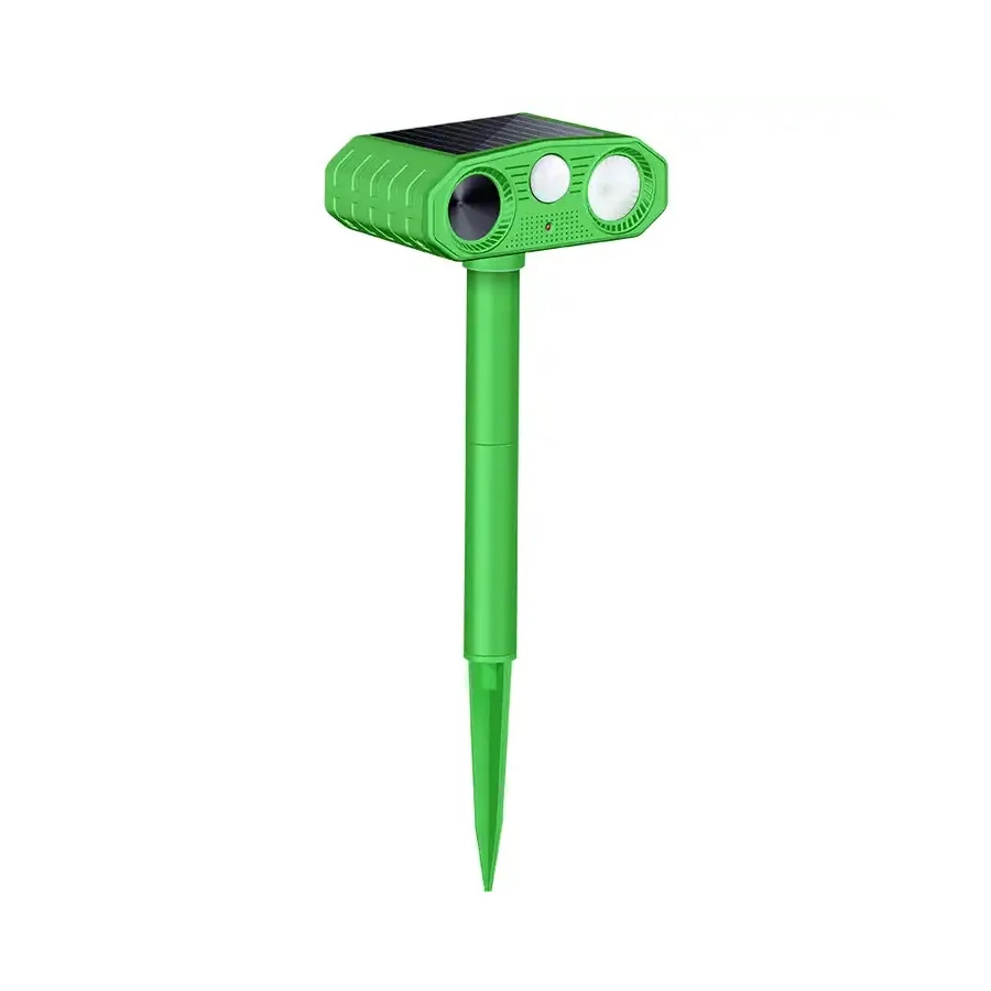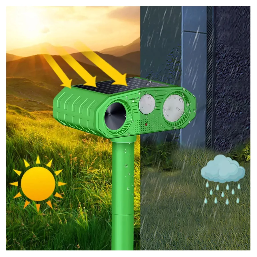 Ak chcete ochrániť svoj krásny trávnik pred poškodením zverou alebo chcete zabrániť divej zveri priblížiť sa k vášmu domu alebo ovocnému sadu, tento solárne napájaný odpudzovač zveri je tou najlepšou voľbou. Pomocou plašiča zvierat môžete vytvoriť tiché a pokojné prostredie, ktoré nebude rušené zvieratami.Môžete si ho vziať so sebou aj na kempovanie, aby ste mohli pokojne spať v stane. Ultrazvukový herný alarm má zabudovaný vysokocitlivý snímač pohybu.Keď do oblasti pokrytia vstúpia živé zvieratá, rozsvieti sa svetlo LED s farbou nastavenej funkcie, potom zariadenie vysiela vysokofrekvenčný zvuk a ultrazvuk a silné blikajúce svetlo počas 15 sekúnd pod uhlom 120° v okruhu 12 metrov, čím odradí nežiaducich votrelcov a narušiteľov. Zariadenie sa automaticky nabíja zo solárneho panela počas normálneho slnečného obdobia, ktoré možno nahradiť nabíjaním z USB počas zamračených, menej slnečných období.